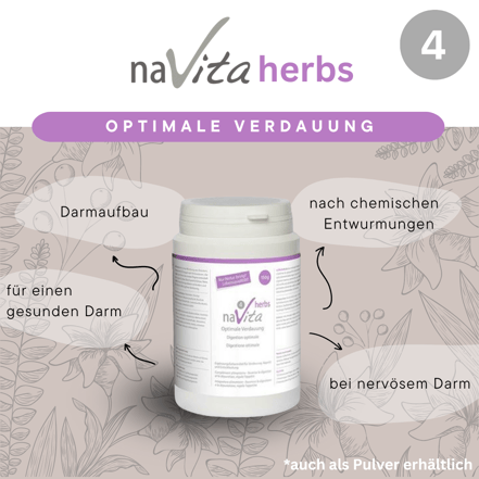 Hier unterstützt man den Organismus des Hundes am einfachsten, mit einem Darmaufbau. Hierfür verwende ich das NaVita-Darm-Sana am Morgen und Navita-Herbs 4 am Abend während 4 Wochen.